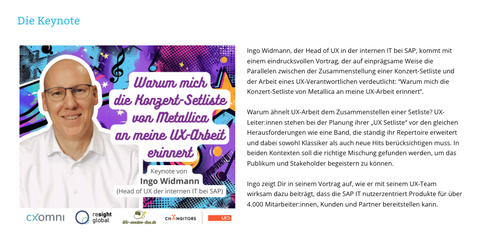 Nach einer Keynote von Ingo Widmann, Head of UX in der internen IT bei SAP, schossen mir hunderte von Gedanken durch den Kopf. Ingo berichtete von der Einführung von einer User centric IT bei SAP im Dezember 2016 und seine Metapher “Warum mich die Konzert-Setliste von Metallica an meine UX-Arbeit erinnert” und “Wie stelle ich die richtige “UX-Setliste” zusammen, um die Stakeholder zu begeistern.